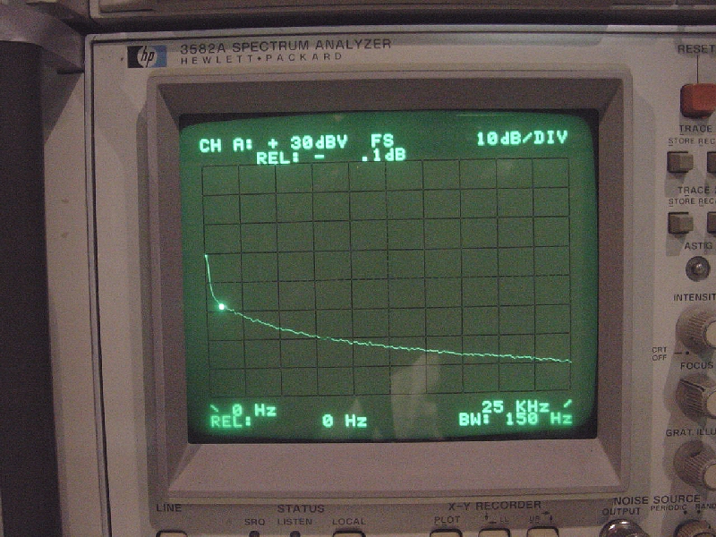 The Hewlett Packard 3582A screen is displaying measured frequency response of a PP1 phono preamp module. Random white noise is applied to the input of the preamp. The spectrum analyzer display settings are 10dB per vertical division and 2.5KHz per horizontal division. Frequency bandwidth displayed is 0Hz to 25KHz. Total overall amplitude differential is just under 40dB with the 0dB reference at 1KHz as indicated by the marker. Note that this display looks somewhat different than the ideal RIAA curve above. The ideal equalization diagram is based on a logarithmic horizontal scale whereas the spectrum analyzer display is a linear scale. |